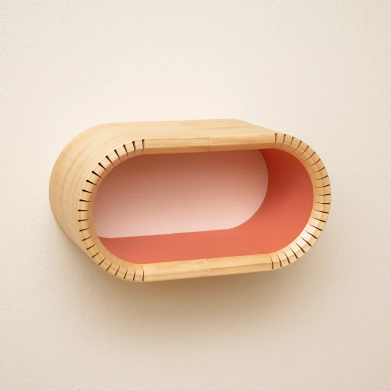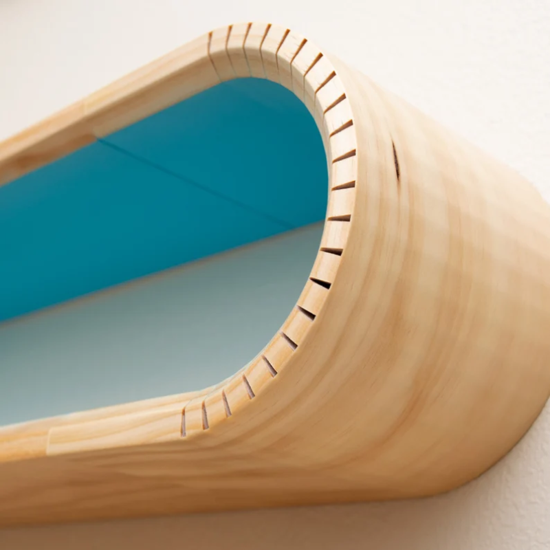 Add a splash of color to any living space with this handcrafted bentwood floating shelf. As functional as it is beautiful, the sturdy multi-leveled design provides increased storage space. This shelf is constructed from real solid pine wood with a natural wood exterior and painted interior. Ideal for any room from bathrooms to bedrooms, and everything in between There are three interior color variations; green, salmon, and blue. As well as three size options; 12", 22", and 32". All shelves are finished with a semi-gloss polyurethane, making them water and scratch-resistant.