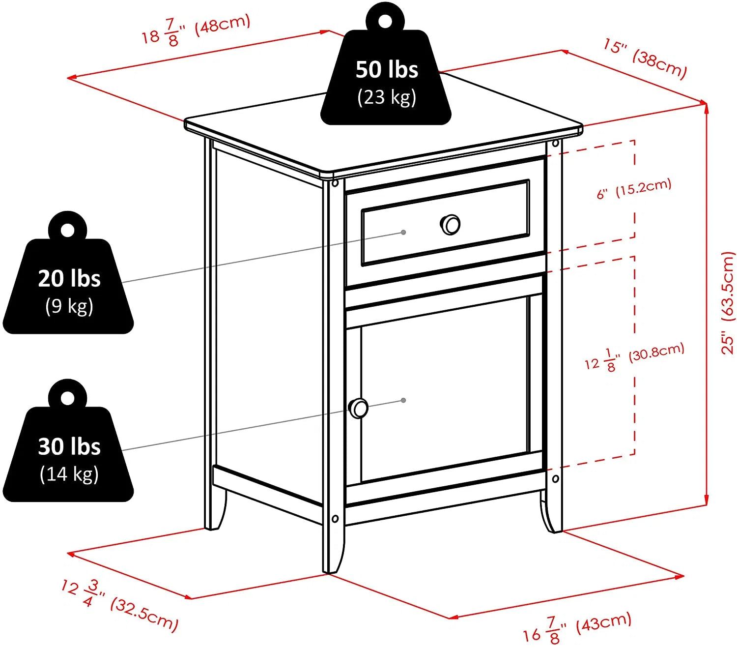 • Side Cabinet Interior Dimensions: 13"W x 14.76"D x 22.83"H (Adjustable Shelf)