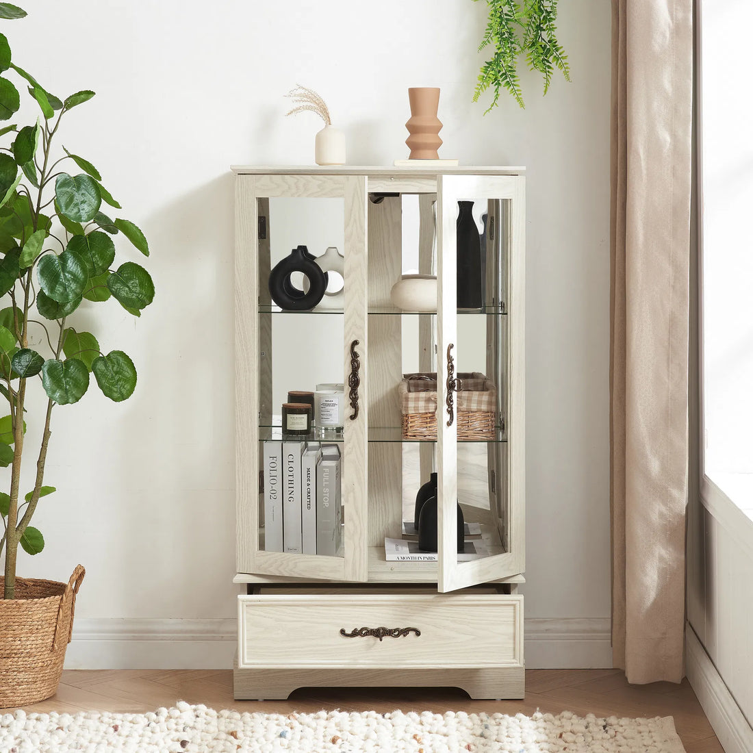 Highlights American retro style Glass cabinet:Crafted with curved legs , a big drawer and metal...