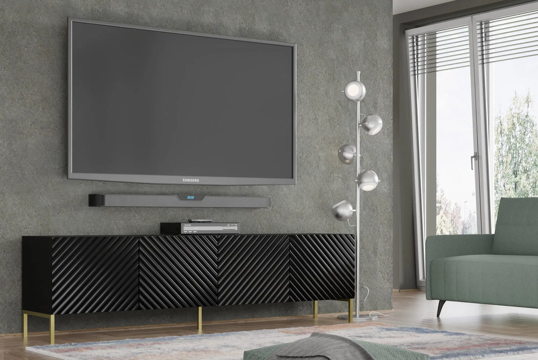 Highlights Crafted with clean lines and intricate geometric patterns, this three-door TV stand embodies modern...