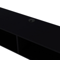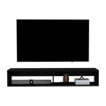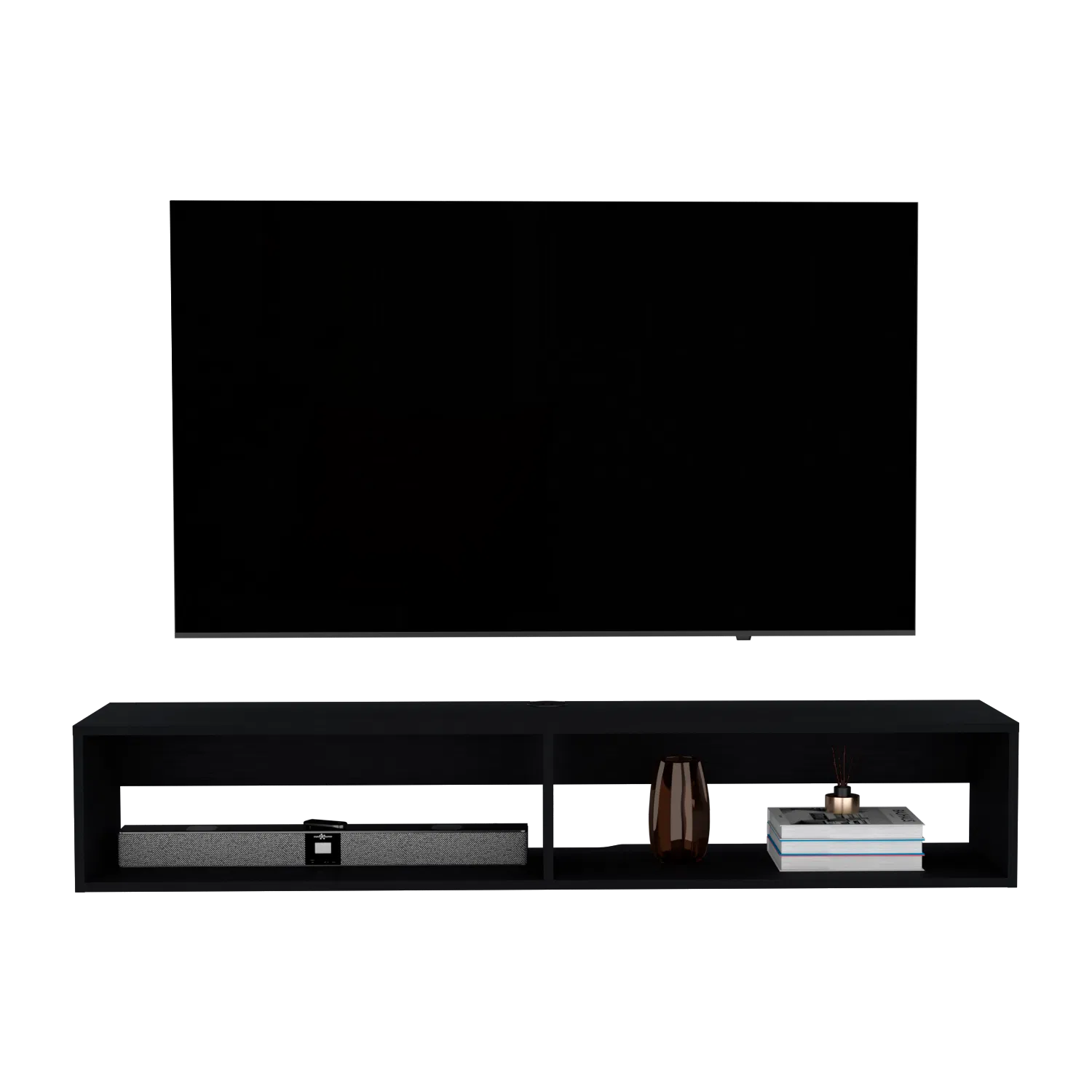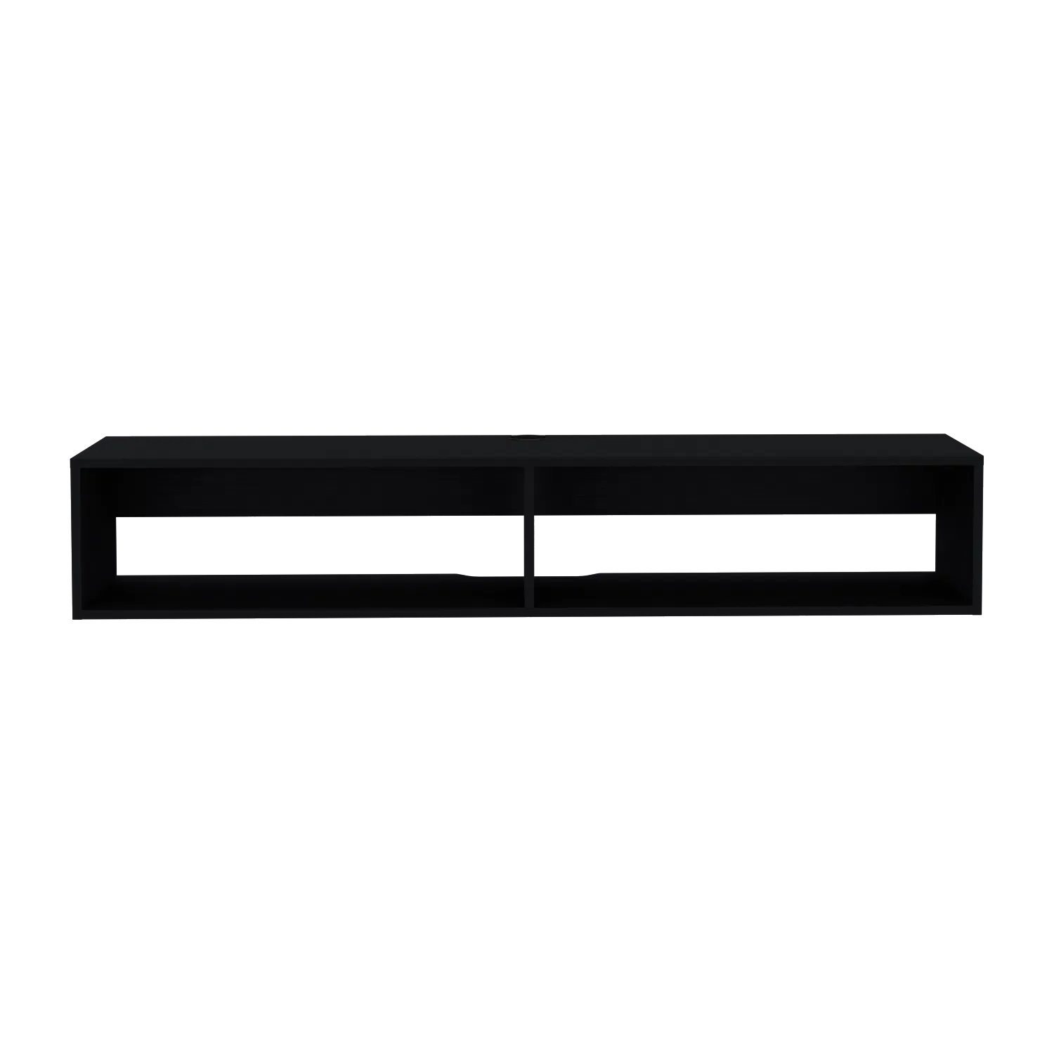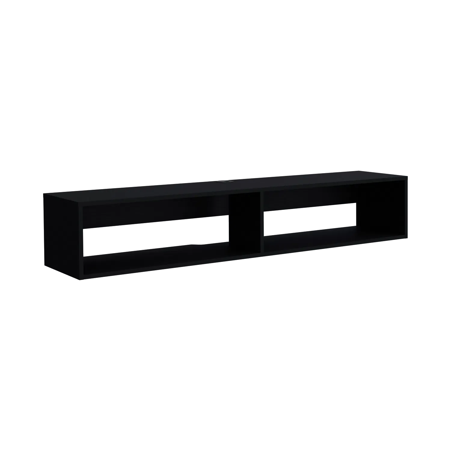 Enhance your living room with the modern and sleek Floating TV Stand Moore. Designed to complement any decor, this floating stand is made from black manufactured wood, offering both style and practicality. It features two spacious shelves (9.2"H x 8.8"D x 28.6"W), ideal for storing media devices, decor, or other essentials. The built-in cable hole ensures easy cable management for a tidy, clutter-free space. Perfect for mounting your TV, it creates a clean, contemporary look in your living room.