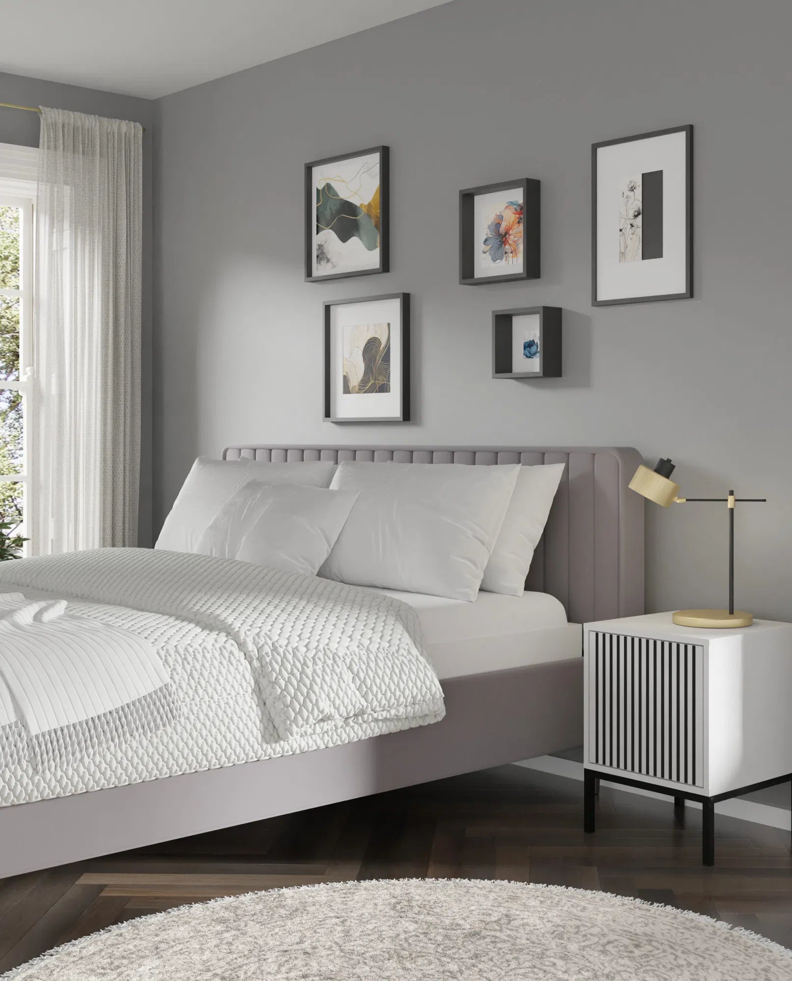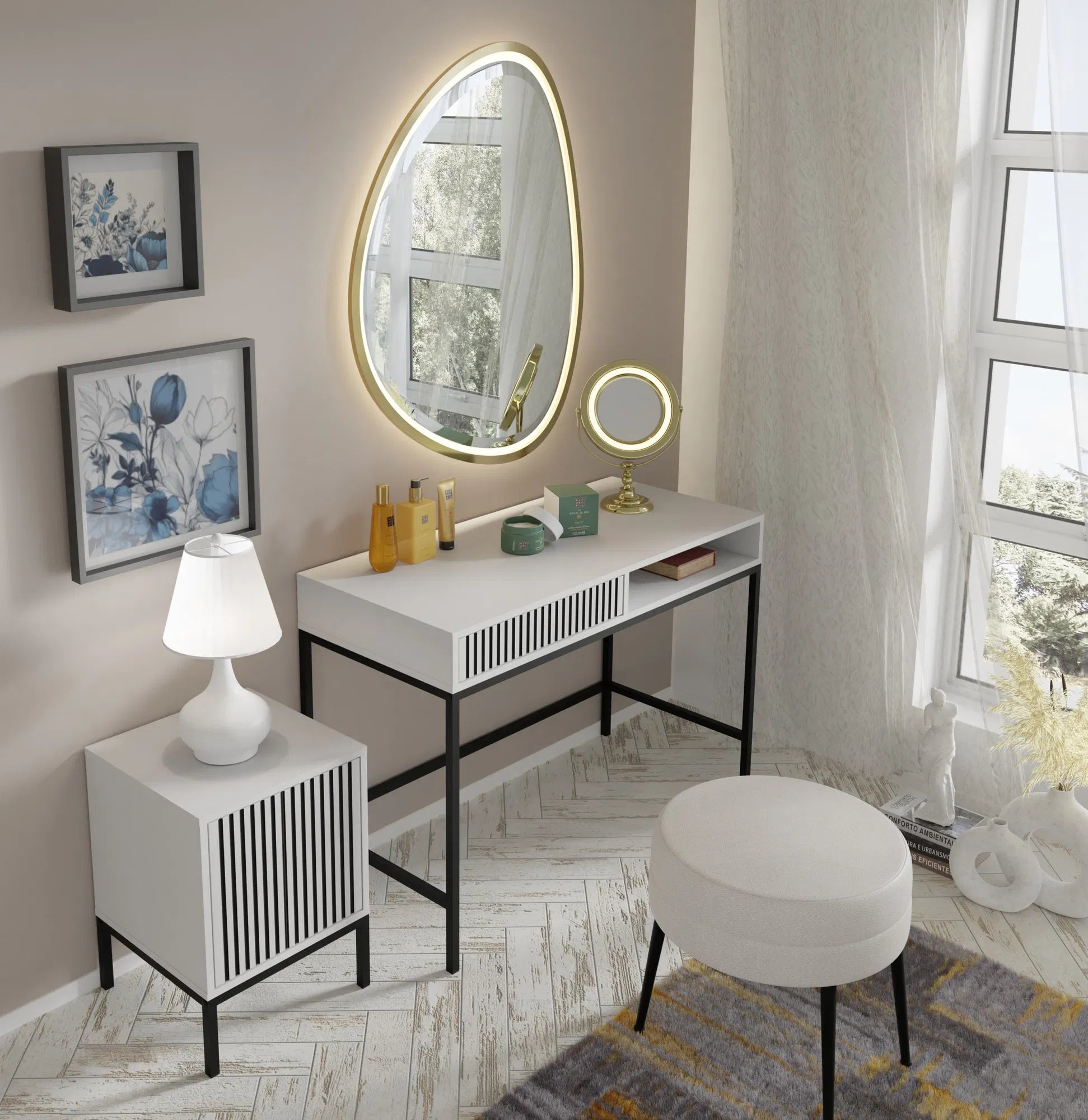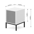 The Ravenna collection features elegant and unique furniture, with milled fronts that add a striking decorative element. The classic yet modern color combination of matte white with black milling is a standout feature. Crafted from high-quality materials, including milled, painted MDF board, the furniture is complemented by sleek metal legs that not only enhance its stylish appearance but also provide stability. The handle-free fronts contribute to its contemporary design. This versatile piece works perfectly as a nightstand, small storage unit, or side table, offering a single enclosed compartment to store your essentials.