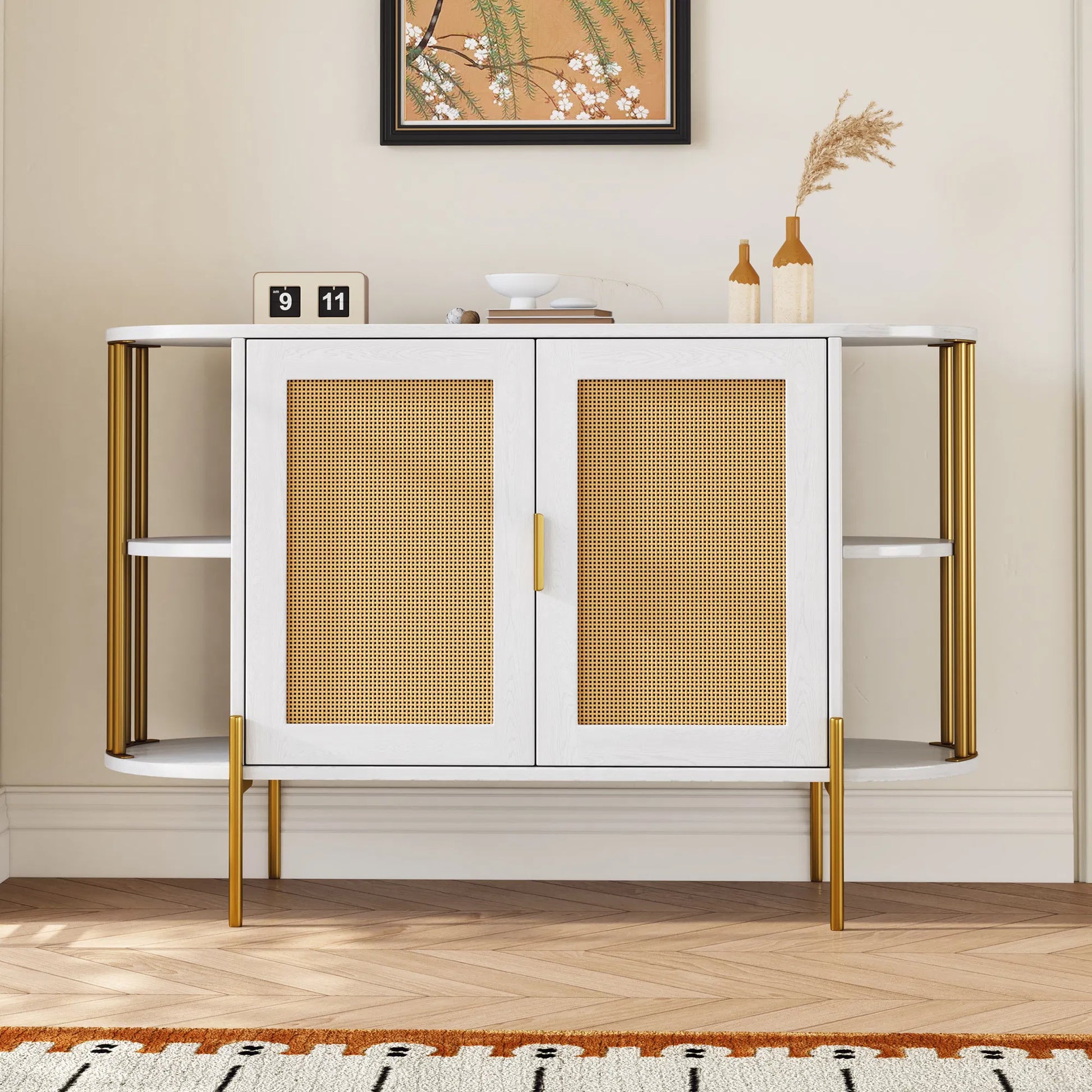 2-Door Elegant Curved Dining Cabinet with Gold Trim & Woven Rattan Doors – Stylish Storage for Dining Room