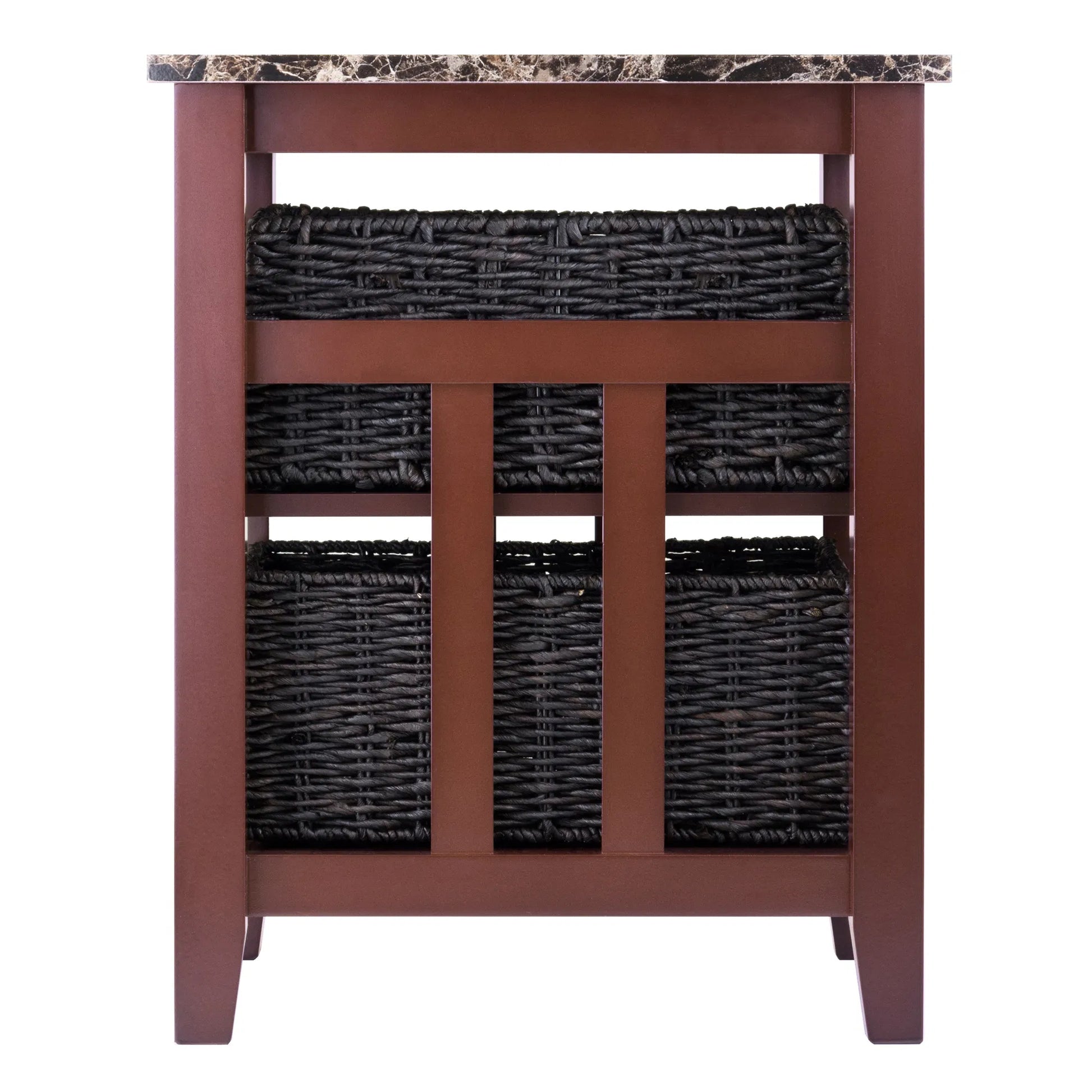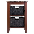 The Zoey Collection adds a touch of elegance to solid wood designs. The Zoey Side Table features a sturdy solid wood frame finished in dark chocolate, topped with a stylish dark faux marble surface. Beneath the tabletop, two shelves house two woven baskets in a matching dark color, providing ample storage. This combination makes the Zoey Side Table both functional and aesthetically pleasing.